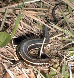 ニホントカゲ Eumeces latiscutatus [トカゲ科] 分布:北海道、本州、四国、九州、国後、隠岐、見島、壱岐、五島、大隅諸島など 全長20〜25cmで尾はその約五分の三。四肢は比較的良く発達し、掌部には大小のいぼがあり、爪と共に穴掘りに使われる。鱗は滑らかで光沢があり、頭部を除いて皆同じ形をしている。関東以西ではごく普通に見られ、海岸から高山まで生息し、日当りの良い草地やガレ場、石垣、土手などに多い。色彩や体型は年齢や性によって大きく異なる。幼体は黒地の背面に黄白色の五本のストライプがあり、尾の先は鮮やかな青色である。この色彩は成長と共に消失し、次第に明るい茶色になっていく。雄はあごが発達し、頭は三角形となる。4月中旬〜5月中旬にかけて交尾期を迎え、雄は喉から腹にかけてと頬に赤い婚姻色が現れる。この時期、雄同士が出会うと頭部を咬み合う激しい闘争を行う。雌は5月下旬〜6月中旬に5〜16個の卵を産み、雌は卵が孵化するまで保護する。 |