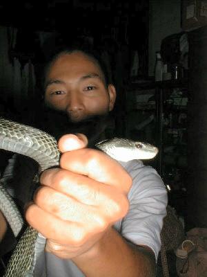 アオダイショウ Elaphe climacophora [ナミヘビ科] 分布:北海道、本州、四国、九州、国後、奥尻、佐渡、伊豆大島、新島、式根島、神津島、隠岐、対馬、壱岐、五島、薩南諸島など(南限はトカラ列島の口之島) 本土では最大の蛇で、全長は1〜2m。全身が褐色を帯びたオリーブ色で、あまりはっきりしない四本の暗い縦条がある。幼蛇は背面の地色が白っぽい灰色か褐色で、中央に濃褐色の横斑が並び、その両側にも同じ色の小斑が各一列に並んでいる。成長に伴い、これらの斑の縁が前後に伸びてきて黒っぽくなり、四本の縦条を形成する。腹板、尾下板、体鱗などの鱗数が本土の蛇では最も多い。胴の横断面がかまぼこ形で、腹面の両側は角張っている。ここを引っ掛けて樹上によく登るが、地上に長々と伸びて日光浴をしている姿を見ることも多い。主に日中に活動するが、左の写真のものは夜中に鶏舎に入ってきたところを捕まえた。主な食物は鳥と哺乳類だが、爬虫類や両生類も食べる。この家に住み着いているものはよくネズミ退治をしてくれる。食道内に脊椎骨による突起が鋸状に並び、卵を飲んだ時にはここで殻を割る。 |