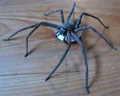アシダカグモ <脚高蜘蛛> [クモ綱クモ目アシダカグモ科アシダカグモ属] 日本には1000種類以上、世界では30000種類以上のクモがいる。 英名:spider 分布:本州(関東以南の太平洋側)、四国、九州、沖縄、世界の温帯から熱帯に広く分布 網を張らない徘徊性の大型のクモで、頭胴長3cm、脚を広げると12cm以上に達する。平均寿命は雄5年、雌7年程で、雄は8回、雌は10回脱皮して成体となるが、その後雄は1回、雌は3回脱皮する。雄では触肢の先が膨らんで生殖器の一部となる。よく人家に住むが、室内を歩き回ることは少なく、食べ物の上なども這わず、人を咬むこともない。また人に害を及ぼすゴキブリ(特にクロゴキブリ)を好んで食べ、消化液には病原菌を殺す力もある。時にはトノサマガエル、カヤネズミなどを食べることもある。産卵は日本では年2回、卵嚢を作り、1回の産卵で300個前後産む。母グモは卵嚢の中で子グモが孵化するまで餌を食べずに卵嚢を抱えている。孵化すると卵嚢を離すが近くにいて見守る。子グモは1週間程すると出廬し、更に1〜2日すると分散する。分散する時は風のよく通る場所に移動し、風が吹いてくると腹部から糸を出し、糸と共に風に乗って飛ばされ遠くまで分散する。 |