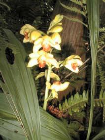 ガンゼキラン Phajus minor BLUME [ラン科ファイアス属] この属はエビネ属に近縁で、日本南部より熱帯アジア、インドネシア、ニューカレドニア、ヒマラヤを通り、マダガスカルまでの広い範囲に渡って約30種が知られている。日本には他にカクチョウランがある。 分布:紀伊、東海道、伊豆諸島、四国、九州 開花期:5〜6月 暖地の林中に生育する常緑多年草。葉は幅の狭い長楕円形で長さ20〜20cm、幅5〜8cm、深緑色で先端は尖り、縦に数個の肋(ろく)がある。花茎は茎の基部から側生し、高さ40〜80cmでまばらに5〜20個の花をつける。花は淡黄色で全開せず、がく片は花弁とともに狭長楕円形で先が鈍く、長さ3〜4cm、幅1〜1.5cm、唇弁は倒卵くさび状で少し内に巻き、縁は褐色を帯びる。基部には長さ7〜8mmのけずめがつく。葉に黄斑が入るものをホシケイランと呼ぶ。 |