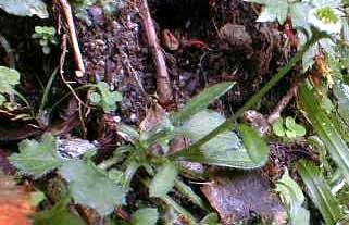 高地の湿った岩上の苔の中に生育している。高さ8cm程で茎の途中に2枚程の葉が付き、茎頂に直径5mm程の頭花が1つ付く。花は赤紫色と白色とある。下の葉は長さ2cm程で2〜3回やや深く切れ込み、這うように四方にのびる。