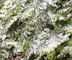 ホソバコケシノブ Hymenophyllum polyanthos (SW.) SW. [コケシノブ科コケシノブ属] 分布:本州(岩手県以南)、四国、九州、沖縄、全世界の熱帯〜亜寒帯 樹幹上、岩上、稀に地上生となる常緑シダ。葉柄は長さ2〜10cm、葉身は2〜4回分岐し、無毛で三角状卵形が多いが、広披針形からほぼ円形まで多型、大きさも長さ2.5〜12cm、幅0.8〜3.5cmと変異に富む。地理的分布でも生態分布でも異常なまでの広分布種で、形態的変異も甚だしい。 |