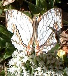 イシガケチョウ Cyrestis thyodamas mabella FRUHSTRFER りんし [鱗翅目タテハチョウ科] 分布:本州、九州、台湾、中国南部、タイ、ミャンマー、インド(ヒマラヤを含む)、小スンダ列島、ニューギニア、ソロモン群島、ロイヤリティ諸島 和名は翅の石垣状の模様からきている。成虫は年数回発生する。屋久島では5月頃から見られ、9月頃から秋型が出てそのまま越冬する。とまる時には翅を開く性質があり、春にはサクラ、秋にはソバなどの花に来る。幼虫の食樹はイチジク、イヌビワ、ガジュマル、アコウ、イタビカズラなどクワ科イチジク属の植物。 |