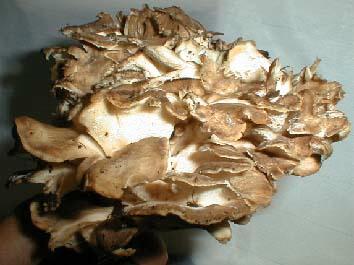 マイタケ <舞茸> Grifola frondosa (FR.) S.F. GRAY [ヒダナシタケ目サルノコシカケ科マイタケ属] 分布:日本、欧州、北米など 料理:キノコ飯、すまし汁、豆腐汁、味噌汁、けんちん汁、煮付、卵とじ、土瓶蒸し、あんかけ、すき焼き、てんぷら、酢の物、しら和え、焼き飯、カレーライス、おろし和え、納豆和えなど 子実体は繰り返し分枝する茎と小枝の先端につくられるへら形、扇形、舌形、半円形などの傘の集まりからなり、株の大きさは50cmを越えるものもある。左の写真のものは20cmほど。弾力のある肉質で、表面は初めは黒っぽいが次第に褪色して淡灰色となり、放射状の繊維紋と不明瞭な環紋を現すものがある。肉は白色でやや繊維状の肉質、味、香りとも爽やかで良い。傘裏の管孔は薄く、白色、孔口は細小、円形〜不正円形で茎に垂生する。茎は根元の部分が太く、繰り返し分枝して大きな塊となり、白色で堅くしまった肉質。秋、いろいろな広葉樹、特にミズナラやクリの老木の根元あるいは枯幹や生木(枝枯れの部分)上に発生する。 |