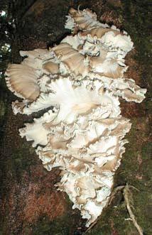 シロマイタケ <白舞茸> Grifola albicans IMAZEKI [ヒダナシタケ目サルノコシカケ科マイタケ属] 分布:日本特産 料理:キノコ飯、すまし汁、豆腐汁、味噌汁、けんちん汁、煮付、卵とじ、土瓶蒸し、あんかけ、すき焼き、てんぷら、酢の物、しら和え、焼き飯、カレーライス、おろし和え、納豆和えなど 子実体は繰り返し分枝する茎と、扇形〜うちわ形〜半円形またはイチョウ形などの傘の集まりからなり、株の大きさは50cmを越えるものもある。左の写真のものは縦50cm、横30cmほど。弾力のある肉質で、表面はほぼ平滑、初め白色、のちキツネ色を帯びてくる。肉は薄く、白色でやや繊維状の肉質を呈するが、マイタケに比べると腰が弱く、歯切れがやや悪い。味、香りとも温和でよい。傘裏の管孔は薄く、白色、孔口は細小、円形〜不正円形で茎に垂生する。茎は根元の部分が太く、繰り返し不規則に分枝して大きな塊となり、白色または僅かにキツネ色を帯びる。マイタケよりもやや早く、初秋にミズナラ、クリなどの老木の根元に発生する。左の写真のものはイスノキの生木上に発生。 |