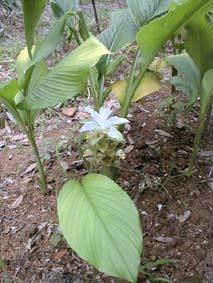ウコン <鬱金> Curcuma longa L. [ショウガ科] 原産:熱帯アジア 開花期:8〜9月 薬用:根茎の成分は黄色の色素であるcurcumin、精油成分としてturmeroneなどが知られ、クルクミンは安全な食品着色料として用いられている。またクルクミンは顕著な胆汁分泌促進作用が認められ、精油成分には胆道結石を治療する効果が認められている。更にクルクミンおよび精油成分に抗菌作用も認められている。肥大根の作用は抗菌作用の他、血液中のコレステロール量を低下させる作用が知られている。 多年草。根茎は肥大して径5〜7cmの卵球形、2方向に分枝し、左右に4〜5本ずつの指状の根茎を伸ばし、粗大なひげ根を持つ。ひげ根の先端はしばしば紡錘状の肥大根となる。根茎の断面は鮮黄色で強い芳香がある。葉は4〜5枚の葉が2方向に出て基部でさやとなり、互いに抱き合って偽茎を形成し直立する。葉身は長さ50〜100cmになり、長楕円形、先端は鋭尖形、基部はしだいに細くなり柄に流れる。辺縁は全縁で上下両面とも無毛、表面は緑色。高さ30〜50cm位の花茎を葉の間から出し、その先端はやや大型の穂状花序となる。花穂は大きな緑白色の包葉が重なり合い、その間に2〜4個の花を順次開いていく。 |