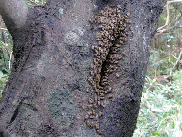 | 海岸から僅か100メートル、標高10メートルほどの所に生えているマルバニッケイの生木の洞(地上高2メートルほど)に作られたニホンミツバチの自然巣。 屋久島の海岸地帯は真夏には高温となるが、生木の洞の中なので、暑い日でも木が吸い上げた水が蒸発する時の気化熱で冷やされ、住み心地は良いと思われる。近くには綺麗な清水も湧いている。 マルバニッケイはクスノキ科ニッケイ属の常緑亜高木で九州の一部のみに分布する日本固有種であり、環境省レッドリストで準絶滅危惧(NT)に指定されている。ニホンミツバチもネオニコチノイド系農薬や外来種のダニによる病気等で生存が脅かされている昨今、絶滅危惧とならないよう願うばかりである。 |