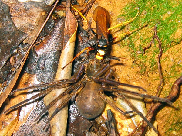 | 体長20〜30mm。頭部前面は鮮明な黄色、翅は黄褐色、肢は基部を除き黄褐色。その他の部位は黒色。東アジア固有種で個体数は少なく、環境省レッドリストにDD(評価するだけの情報が不足している種)として記載されている。アシダカグモ、コアシダカグモ等大型の徘徊性クモを狩り、朽ちた切株や樹洞内に営巣する。写真はコアシダカグモを捕らえて運ぶ雌。 |