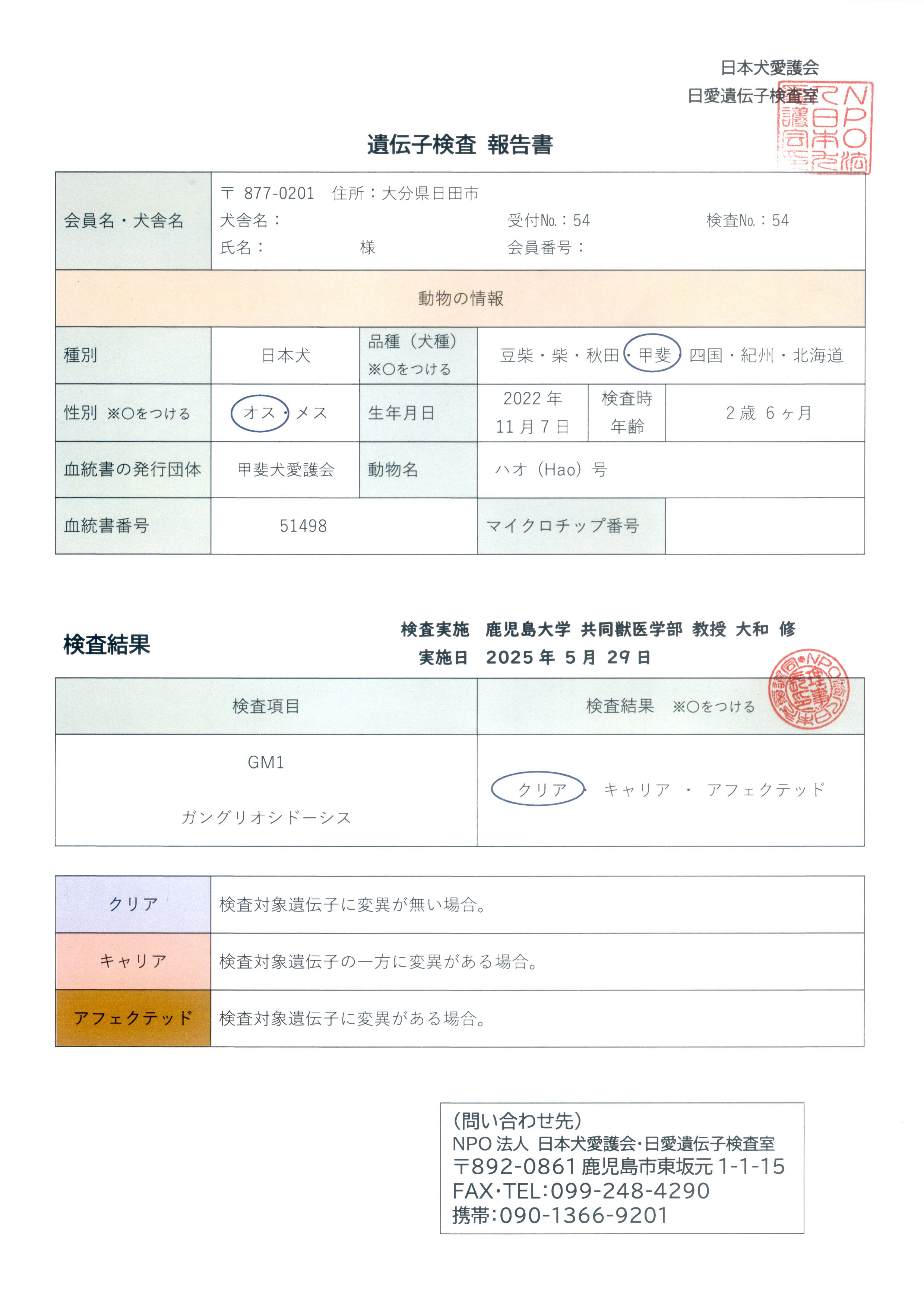 2022年11月7日、熊本県上益城郡山都町生まれ。2023年12月下旬、大分県日田市に移住、猟犬及び家庭犬として大切に育てられている。比較的友好的で遊び好き。甲斐犬愛護会に登録された生粋の甲斐犬(♂)で国指定天然記念物。「紫苑」と同胎。母の異母兄「周防の海王」は愛護会第155回展成犬牡の部1席、母の父の異母妹「童夢の梅花」は愛護会第148回展壮犬牝の部4席、父の母の異母弟「白鳳乃寅太籠」は愛護会第147回展壮犬牡の部5席、父の母の異母妹「白鳳の華」は愛護会第148回展壮犬牝の部6席、父の父の父の父「神流の天真」は愛護会第127回展総合優良犬優勝、父の母の父の父「白鳳の龍」は愛護会第116回展総合優良犬優勝、父の父の父の同胎「夕霧」は救助犬、父の父の母の父の同胎「雲居の雁(2世)」は東日本大震災に出動した救助犬、その息子「玄(Nuuk)」は日本から初めてフィンランドに行った甲斐犬でフィンランド、デンマーク、ドイツ、エストニア等のドッグショーでチャンピオン歴多数他、近親の賞歴等多数あり。アウトブリーディングで生まれた。GM1ガングリオシドーシスの遺伝子検査結果はクリア。 【犬名】血統登録名=ハオ 呼び名=はおちん 【毛色】赤虎毛(黒約2割、茶約8割) 【肩高】52cm 【体重】約21kg 【尾型】巻尾 【嗜好】猪肉、鹿肉、ドッグフード 【犬籍登録・所属団体】甲斐犬愛護会 |