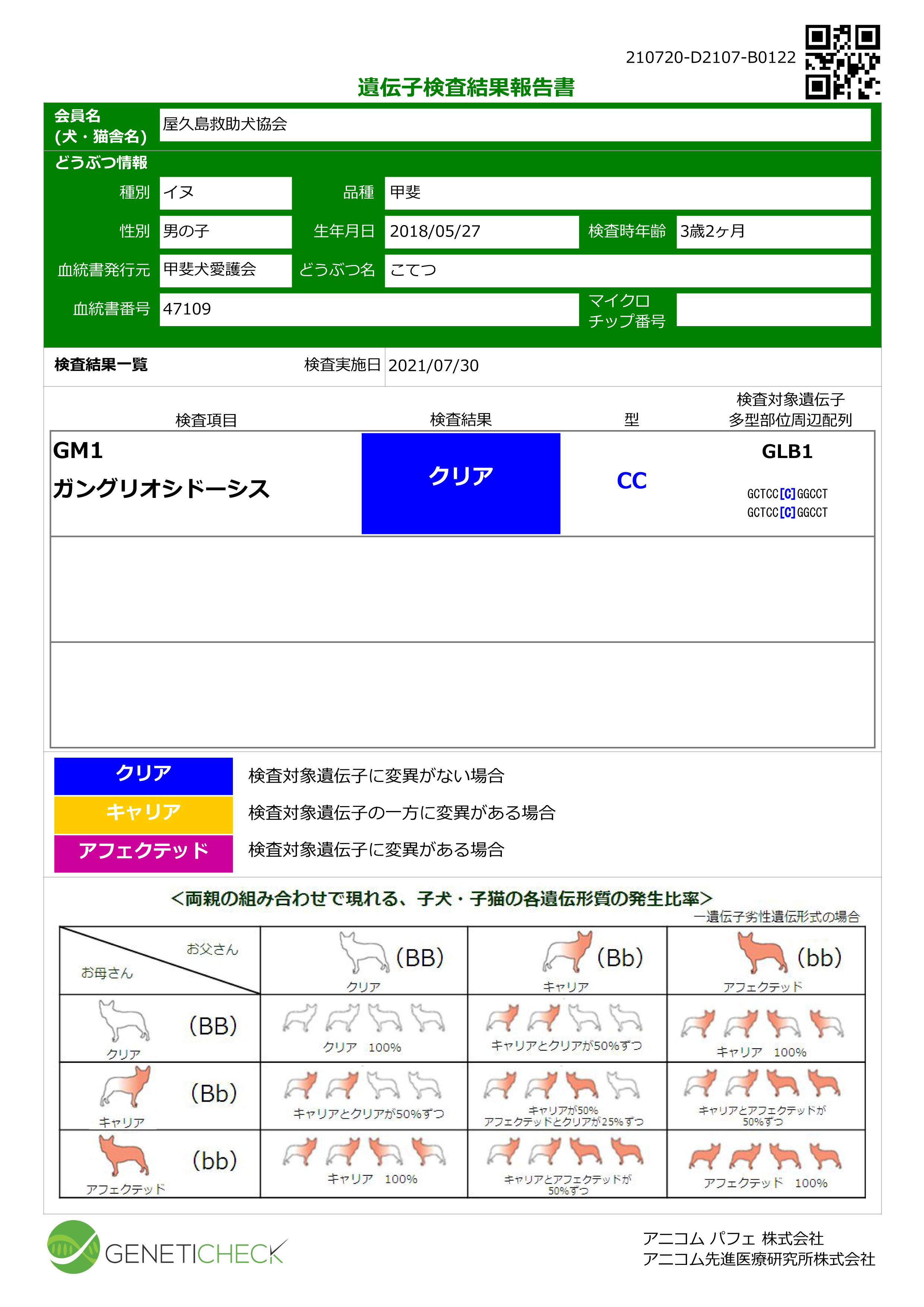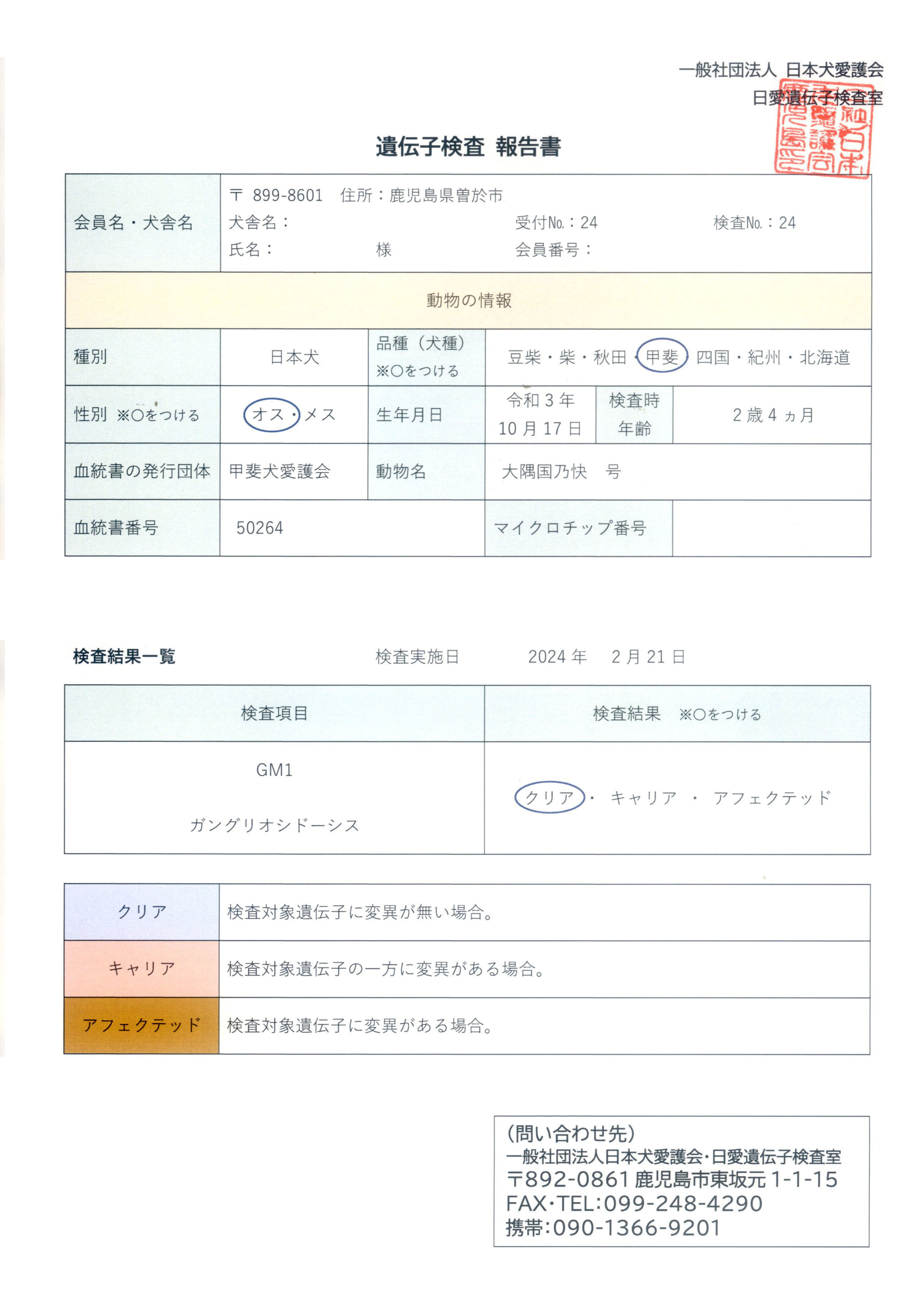 2023年5月28日、鹿児島県曽於市で生まれ家庭犬として大切に育てられている。比較的友好的で、猟犬としても優れた素質を持つ。甲斐犬愛護会に登録された生粋の甲斐犬(♀)で国指定天然記念物。「信玄」の同胎。母の母「祈磨」は救助犬として訓練中、母の父の母「高竜乃朧月夜」、母の父の父「夕霧」も救助犬、母の母の母の母「雲居の雁(2世)」は東日本大震災による被災者捜索に出動した救助犬、その息子「玄(Nuuk)」は日本から初めてフィンランドに行った甲斐犬でフィンランド、デンマーク、ドイツ、エストニア等のドッグショーでチャンピオン歴多数、父の母の父「黒龍神」は愛護会第153回展総合優良犬優勝、父の父の母「甲斐の虎姫」は愛護会第140回展総合優良犬準優勝、母の父の父の父「神流の天真」は愛護会第127回展総合優良犬優勝他、両親とも近親の賞歴等多数あり。ラインブリーディング(近交係数約1.2207%)で生まれた。GM1ガングリオシドーシスの遺伝子検査結果は、母の母「祈磨」はクリア、母の父「虎鉄」もクリア、父「大隅国乃快」もクリアなので当犬もクリア。 【犬名】血統登録名=大隅国乃皐月(おおすみのくにのさつき) 呼び名=さつき 【毛色】黒虎毛(黒約9割、茶約1割) 【肩高】42cm 【体重】約12.8kg 【尾型】登録は差尾だが現状は巻尾 【嗜好】ドッグフード、肉 【犬籍登録・所属団体】甲斐犬愛護会 |