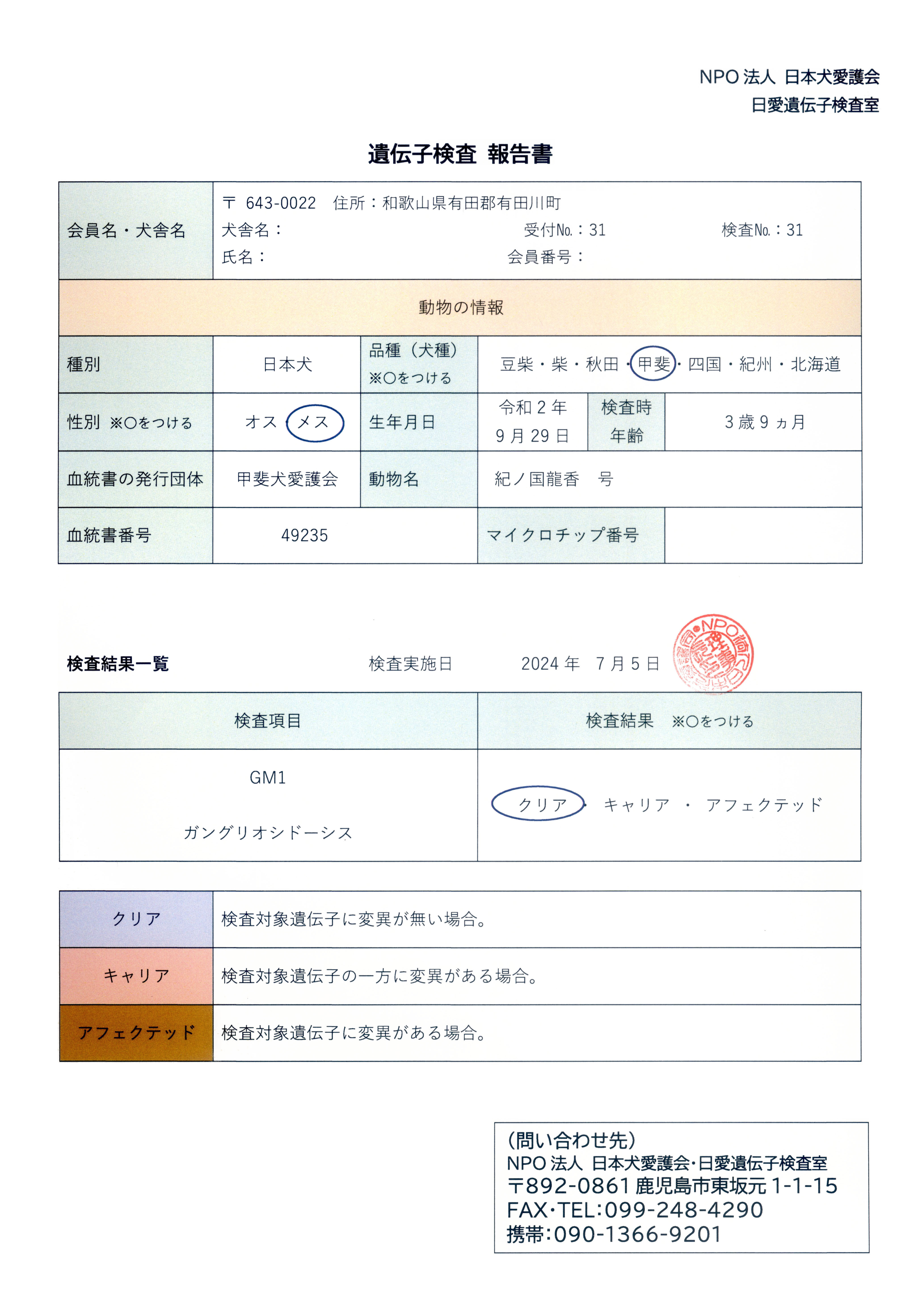 2022年1月7日、和歌山県有田郡有田川町生まれ。家庭犬として大切に育てられている。活発で他人や他犬に対して友好的。甲斐犬愛護会に登録された生粋の甲斐犬(♀)で国指定天然記念物。母の母「舞香」は愛護会第147回展壮犬牝の部1席、母の父「黒龍神」は愛護会第153回展総合優良犬優勝、母の母の父「鉄親」は愛護会第142回展未成犬牡の部1席、母の父の父「彩の神」は愛護会第137回展総合優良犬優勝、父の母の父「国王」は愛護会第125回展総合優良犬優勝、父の父の父「海」は愛護会第133回展総合優良犬優勝、母の母の母の母「御嵩乃多花」は愛護会第129回展総合優良犬優勝、母の父の母の母「甲斐の虎姫」は愛護会第140回展総合優良犬準優勝、母の父の母の父「国秀宝」は愛護会第146回展総合優良犬準優勝、母の父の父の母「彩華姫」は愛護会第127回展未成犬牝の部2席、母の父の父の父「南陽の力皇」は愛護会第130回展総合優良犬優勝、父の母の父の父「国立」は愛護会第103回展総合優良犬優勝他、近親の賞歴等多数あり。GM1ガングリオシドーシスの遺伝子検査結果は、母「紀ノ国龍香」はクリア、父「朱蓮」もクリアなので当犬もクリア。。 【犬名】血統登録名=紀ノ国朱雀(きのくにすじゃく) 呼び名=すず |
