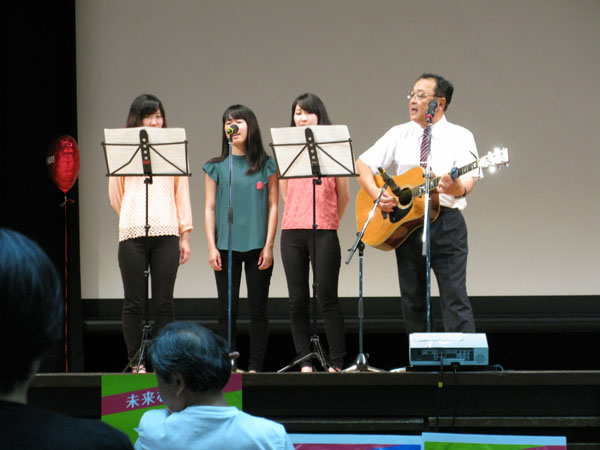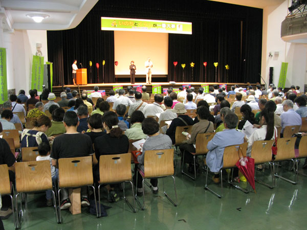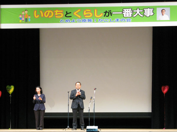 「とめよう原発!かごしまの会」代表平良行雄の挨拶(左は手話通訳)
