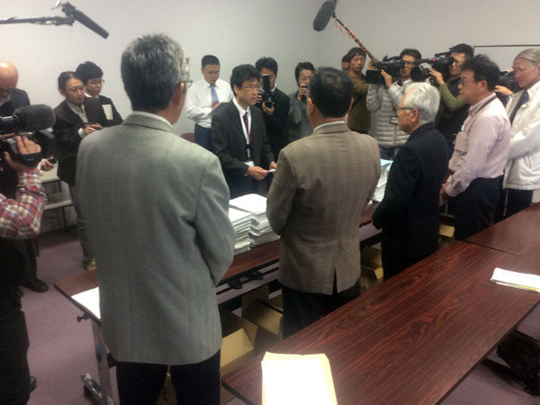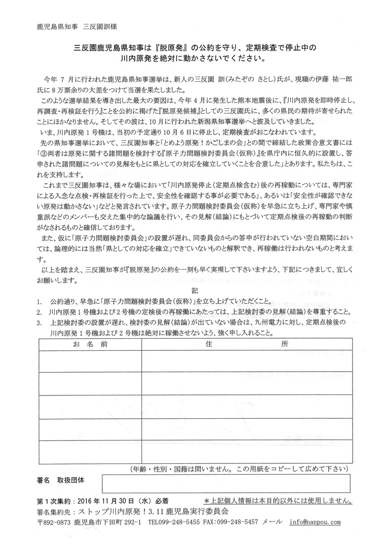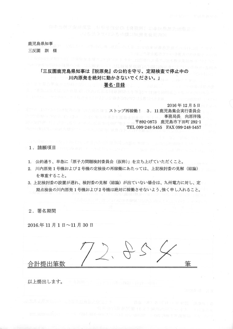 署名は2016年11月1日から30日までの1ヶ月間で72,854筆。知事は直接対応せず、対応にあたった県の担当者は原子力安全対策課の池亀課長補佐でした。