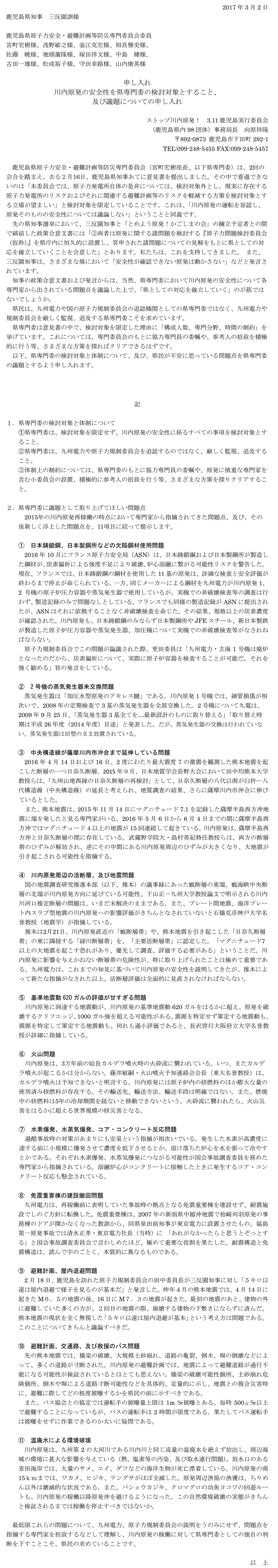 九電や国の追認機関としての専門委は意味がない旨、さらに検討してほしい議題について県庁原子力安全対策課に申し入れ、更にその申し入れ書を知事及び専門委の皆様に郵送