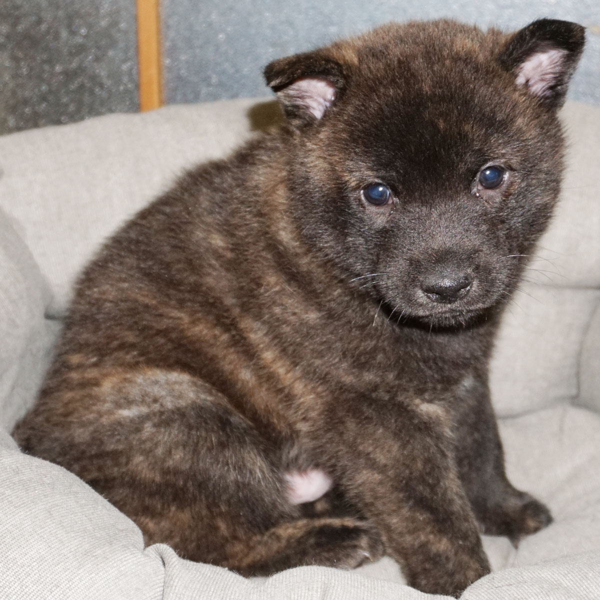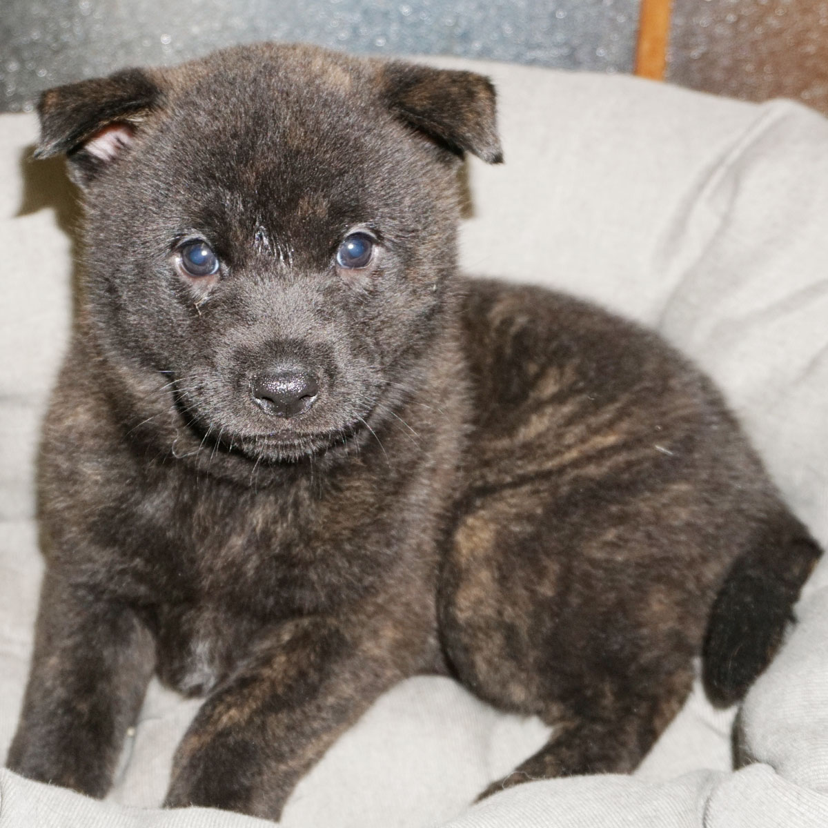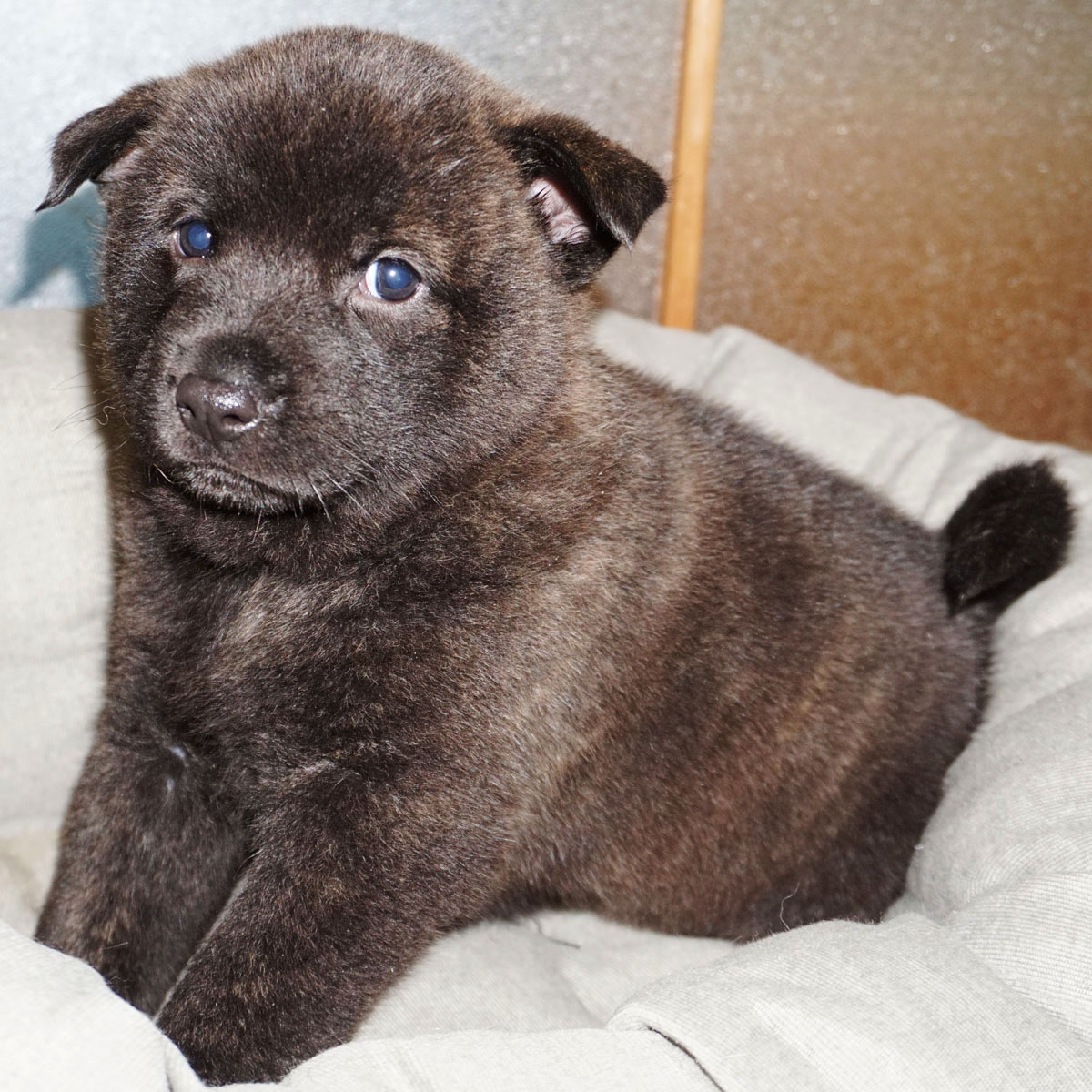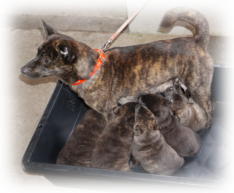 2025年1月28日に「大隅国乃華{呼び名=華(はな)}」が仔犬を出産しました。赤虎毛♂1頭、♀2頭、中虎毛♂1頭、黒虎毛♀1頭の計5頭です。毛色は成長と共に変化しますので、現在の所見からの予想です。血統登録は甲斐犬愛護会となります。大隅国乃華は当犬舎で生まれた犬で、その母「祈磨」は救助犬として訓練中、父の母「高竜乃朧月夜」、父の父「夕霧」も救助犬として訓練・使役した犬たちで、母の母の母「雲居の雁(2世)」は東日本大震災による被災者捜索に出動した救助犬です。仔犬たちの父は「大隅国乃快」で、その母の父「黒龍神」は愛護会第153回展総合優良犬優勝、父の母「甲斐の虎姫」は愛護会第140回展総合優良犬準優勝他、両親とも近親の賞歴等が多数あり、優良な血統で遺伝的な障害も見られず極めて健康です。ラインブリーディング(近交係数約1.2207%)で生まれた仔犬たちです。 |