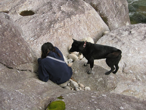 審査員の指示により、指導手は犬にトンネルを通過させ、出口付近で待機させる。