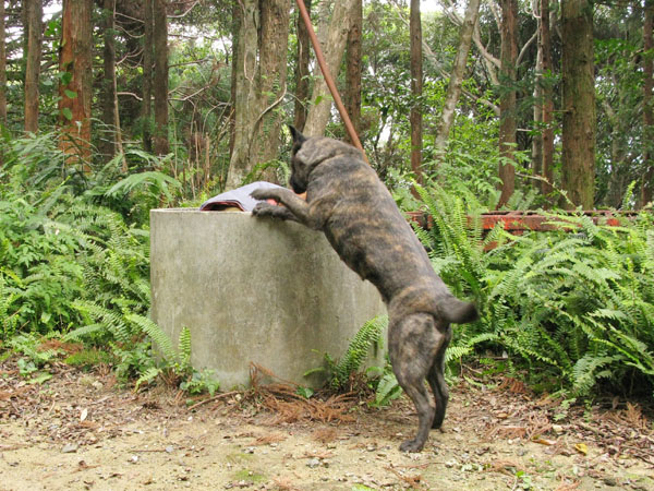 1.瓦礫捜索は、複雑に入り組んだ瓦礫の中で犬が障害物をクリアしながら的確に被災者役を発見し、指導手に知らせることができるかどうかを審査する。