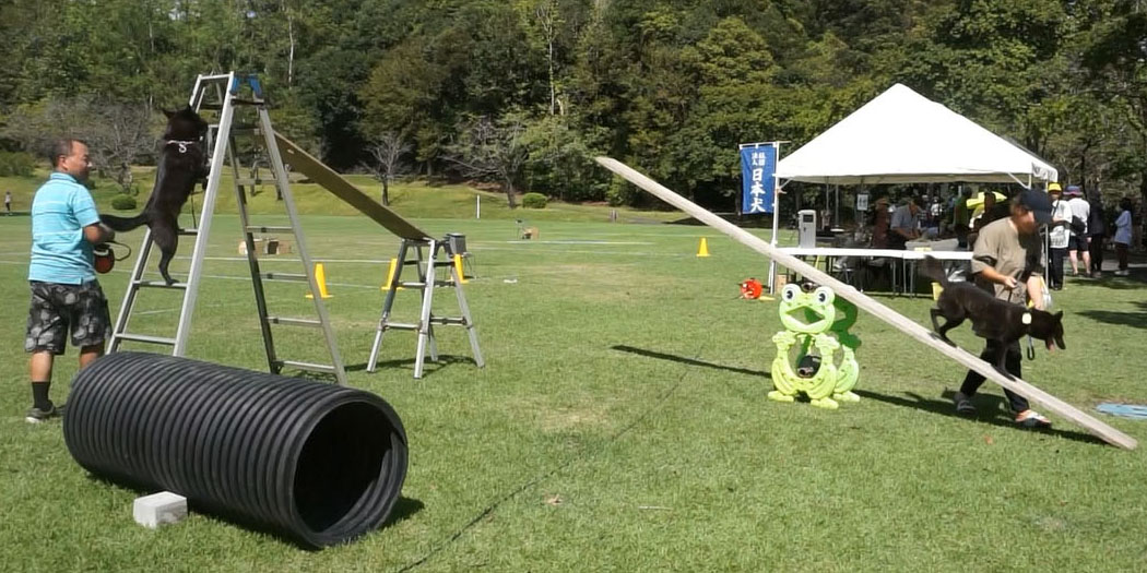 審査員の指示により、指導手は犬にシーソーを通過させ、渡り終わった付近で待機させる。